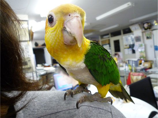 写真を撮る私の肩に乗っているつーつーを見つめるハンターの眼差し!