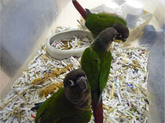 ワキコガネウロコメキシコインコと、ホオミドリウロコメキシコインコの1羽ずつです。